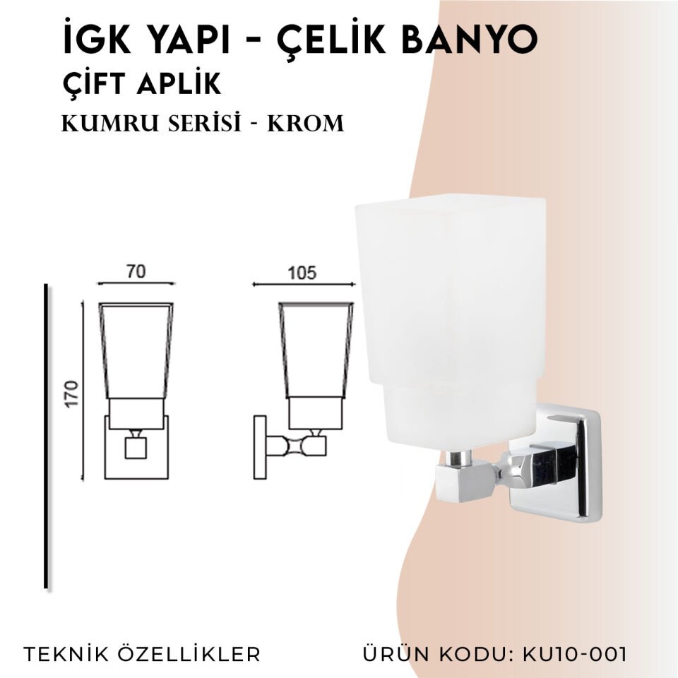 - Uyumluluk ve Seri: KU10-001 model çift aplik, Çelik Banyo'nun Kumru serisinin diğer ürünleriyle uyumlu bir tasarıma sahiptir. Aynı seriden diğer aksesuarlarla bira araya getirildiğinde banyonuzda bütünlük sağlar.