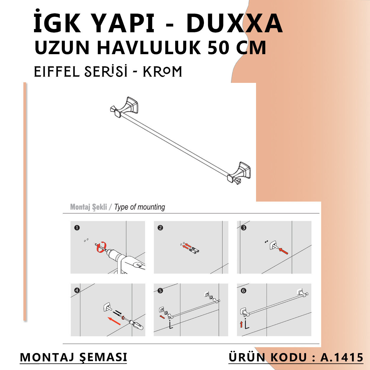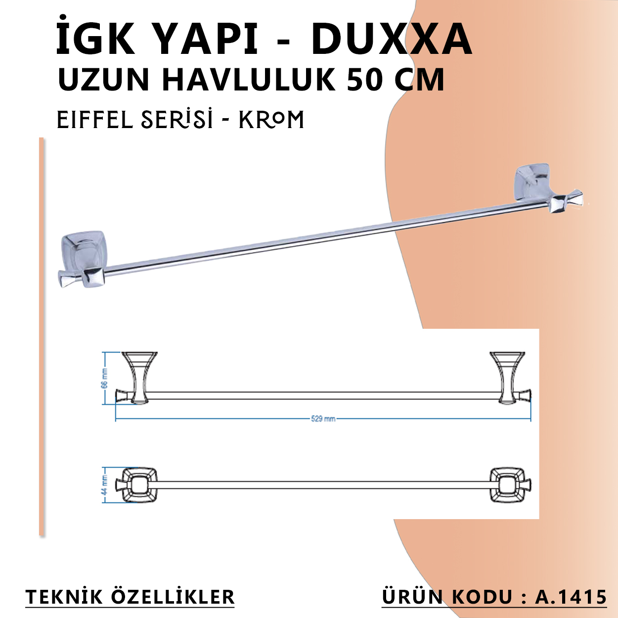 taşır. İGK YAPI - Duxxa Eiffel Uzun Havluluk (50 cm) Krom (A.1415) ile banyonuzda bir yenilik ve